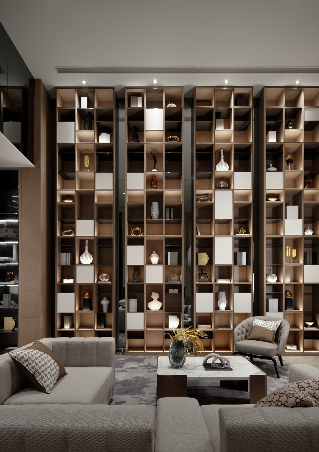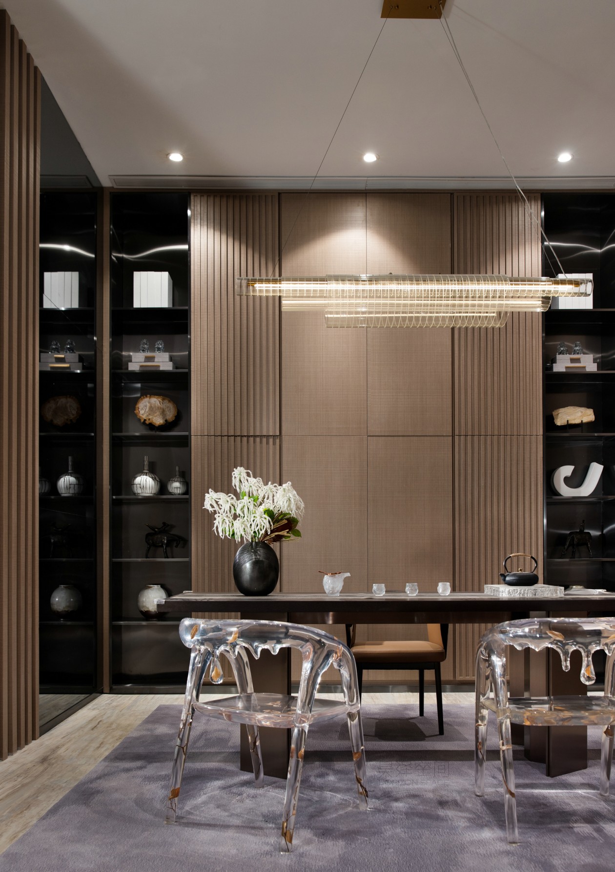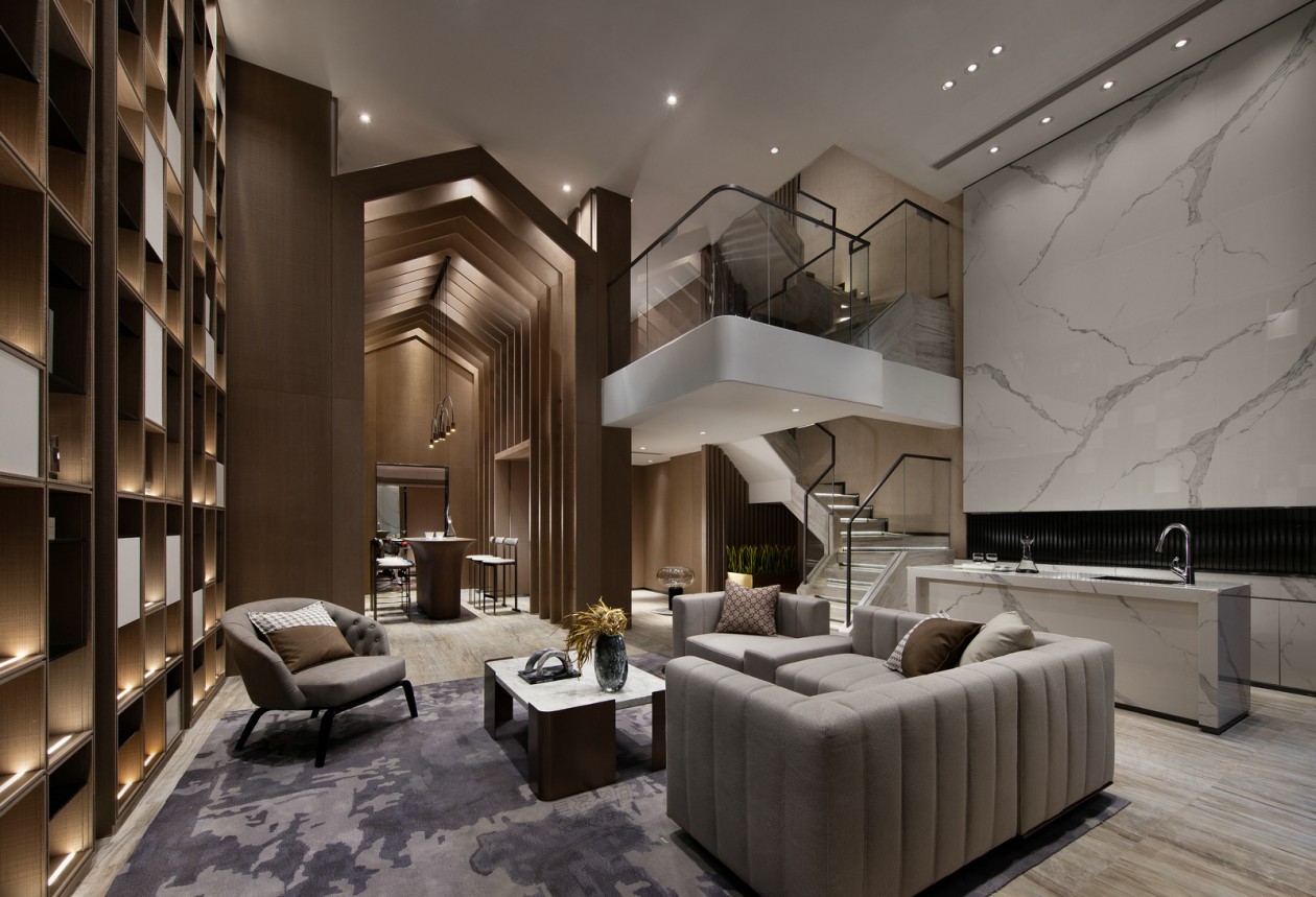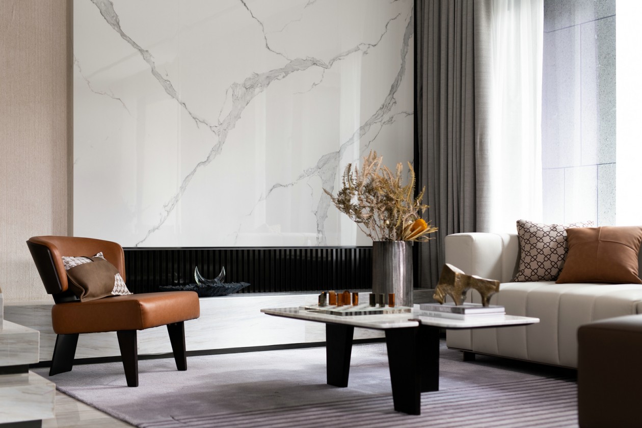 天然大理石的背景墻面,在木質、金屬、大理石構建的幾何介面中,每一種肌理、色彩,讓所見并不止于靜態。