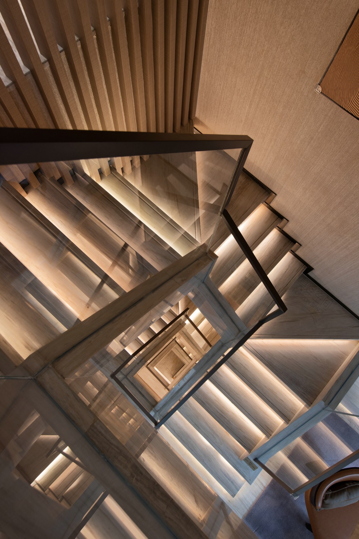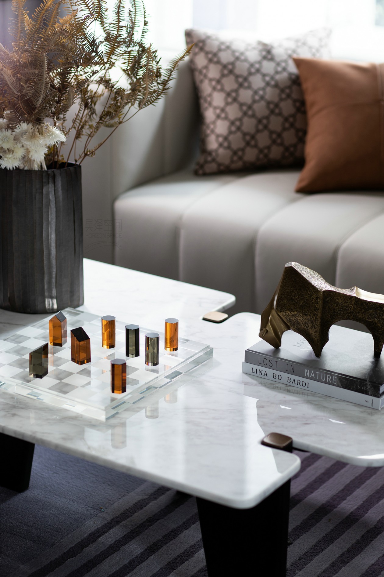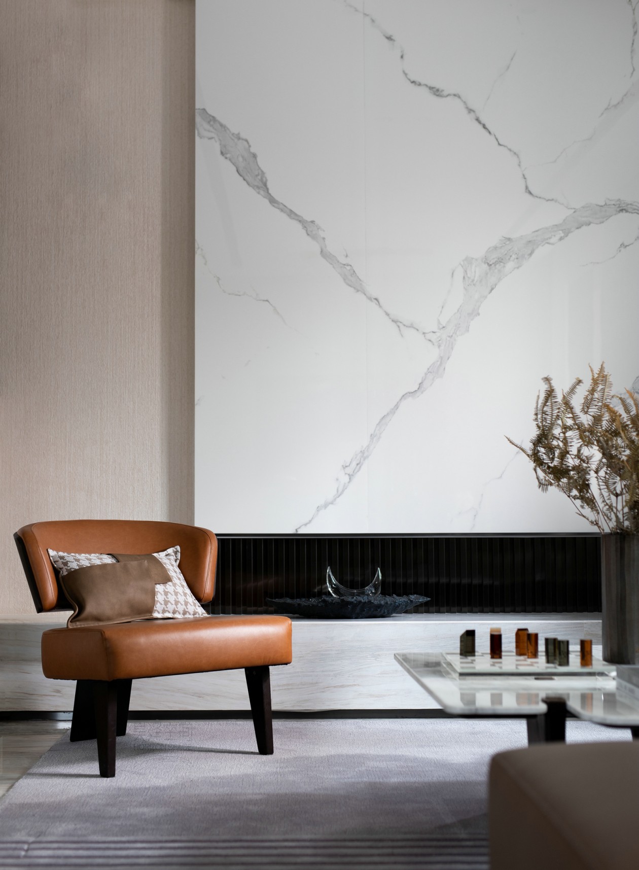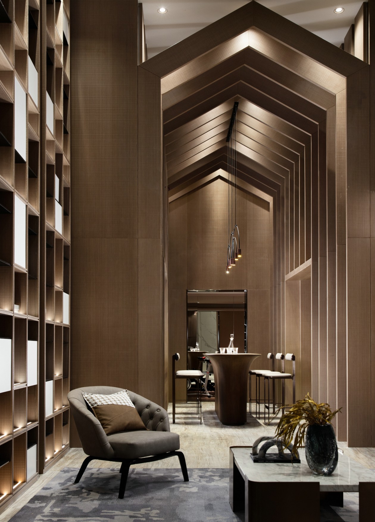 天然大理石的背景墻面,在木質、金屬、大理石構建的幾何介面中,每一種肌理、色彩,讓所見并不止于靜態。