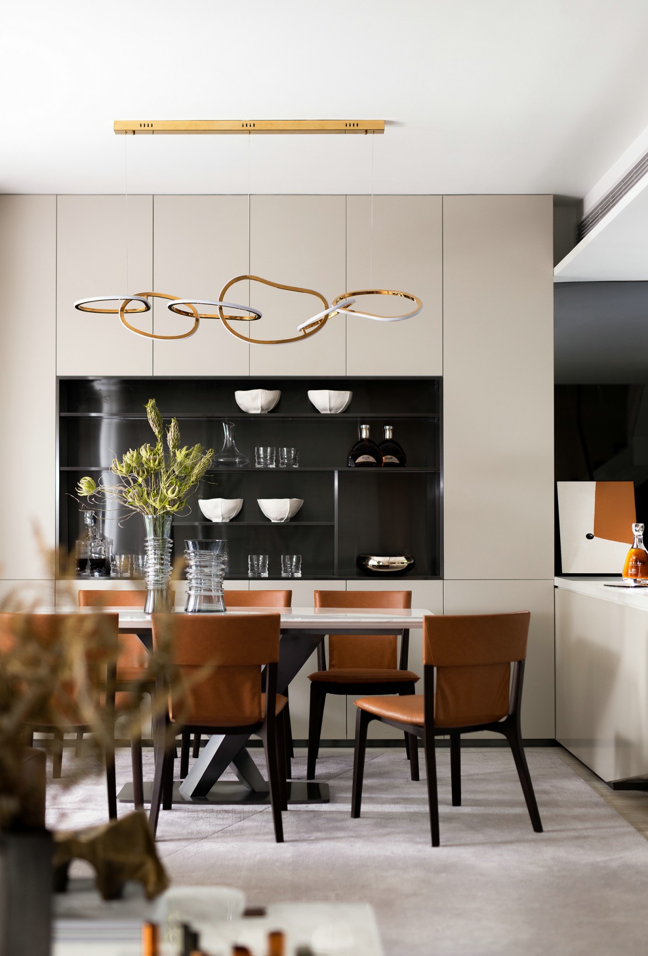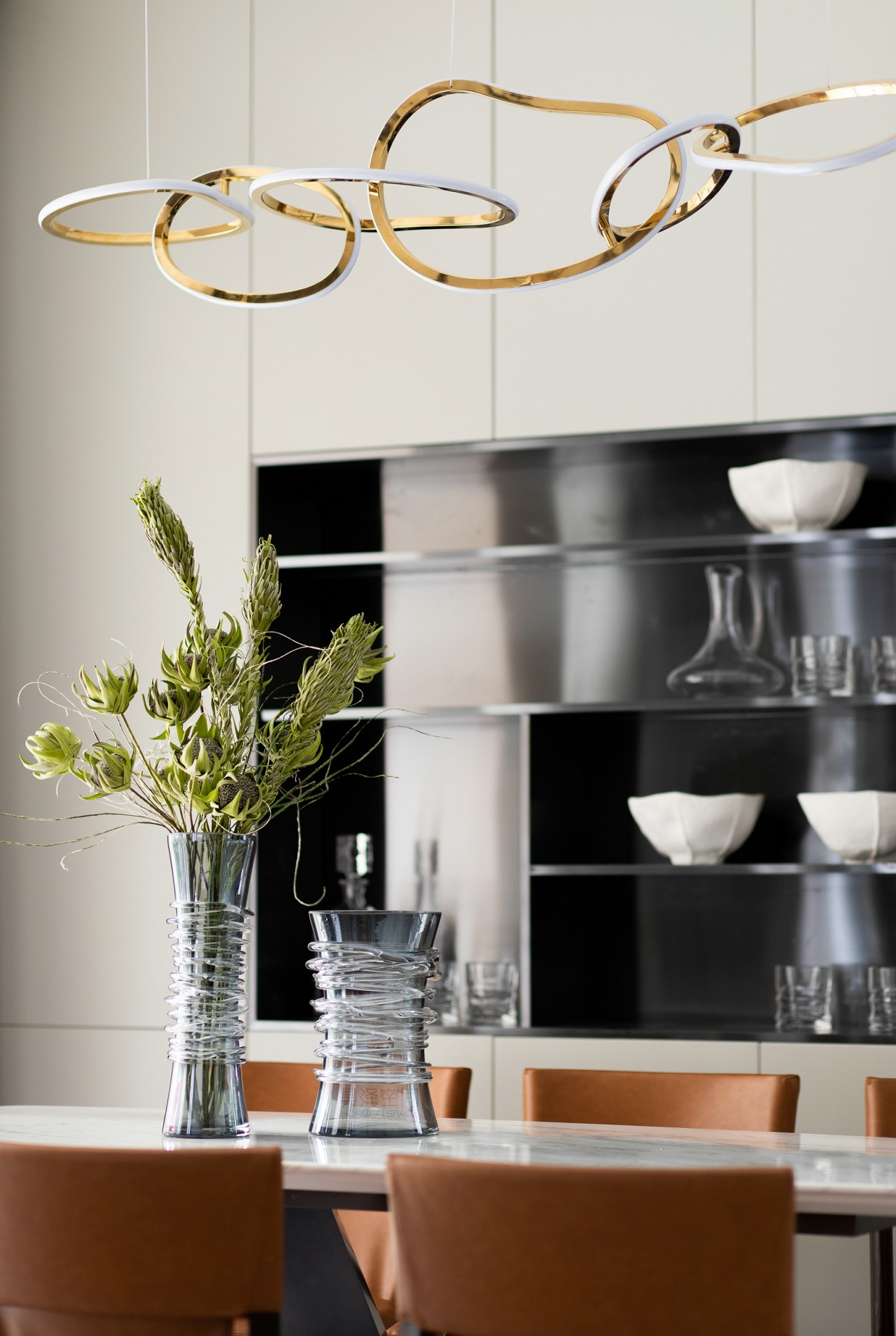 流線線條呼應至餐桌造型花器,家具的每一處動線皆是首尾呼應,空間中處處是對流線的著墨講究。