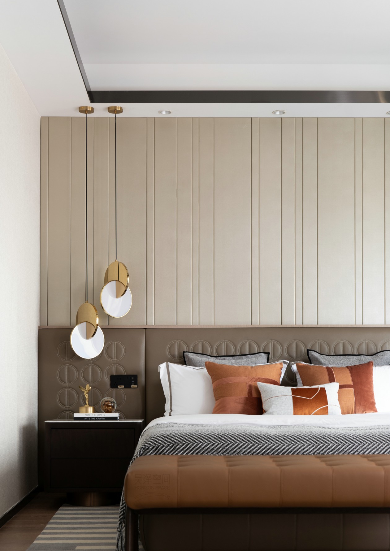 二層開放式的空間充盈著光和寧靜,主臥室層次分明的織物布置,營造出暖意和質感,讓居住者體會到一直以來都被精心打理著的親切。