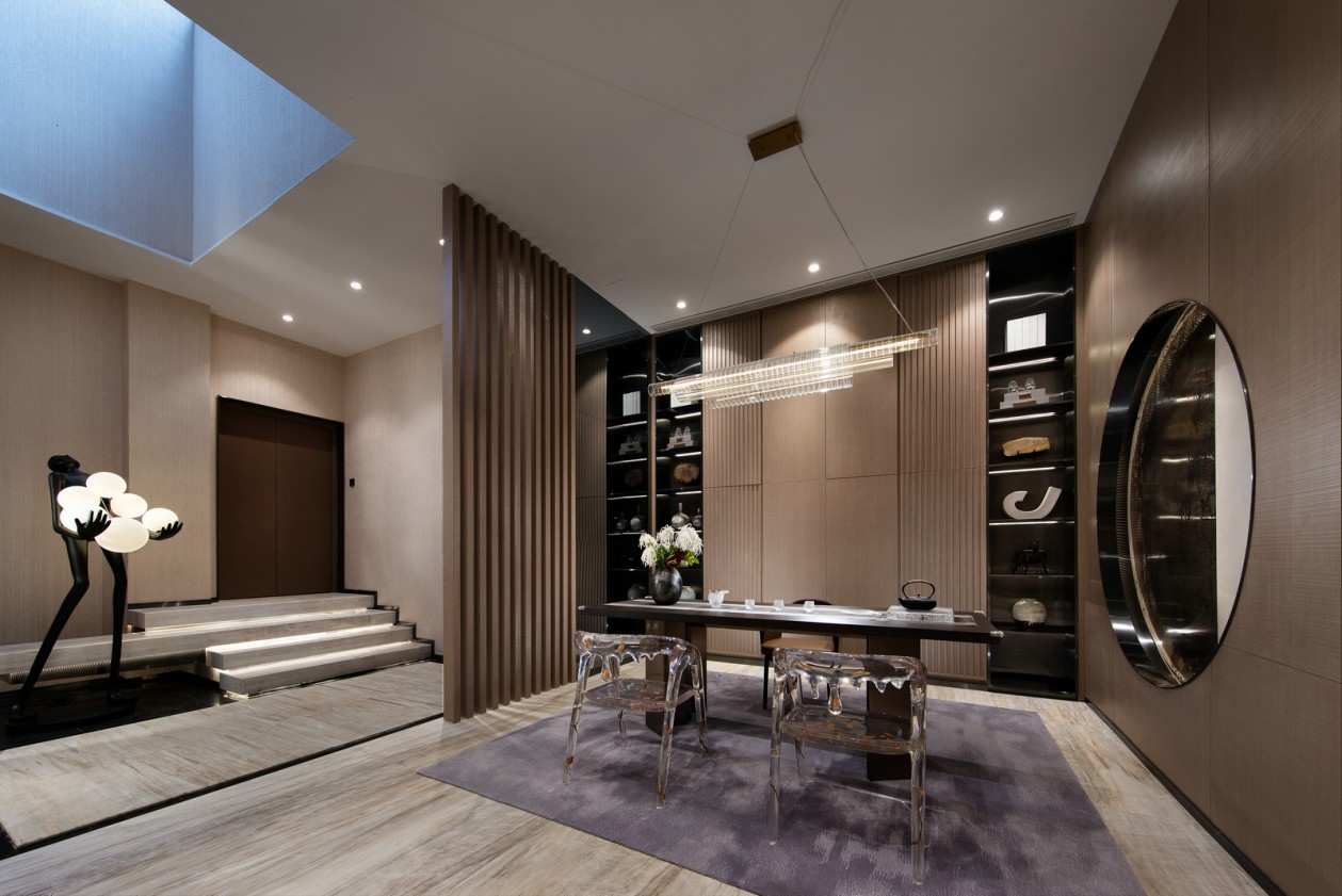 在純粹的現代主義設計中,靜與空是兩種相互依存的設計境界,兩者皆是美的化身,前者強調自然之美,后者強調靈性之美。別墅整體分為地上兩層、地下室一層和夾層,配有紅酒區、品茶室等休閑區,合理有序的空間層次劃分,如畫卷般徐徐展開。